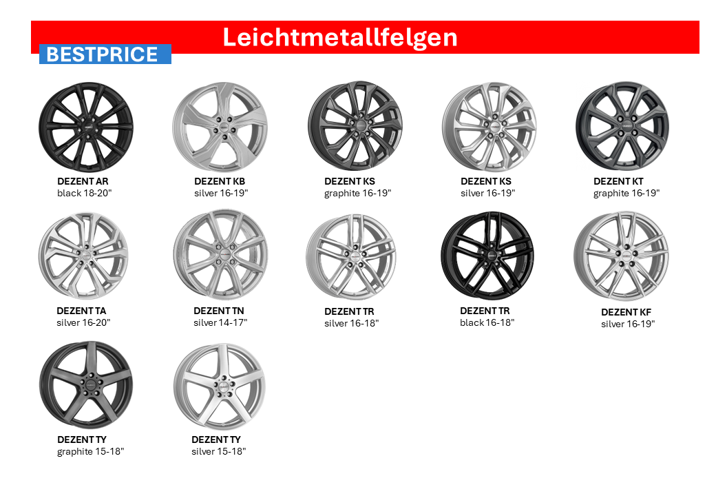 Wir führen ein grosses Angebot an neuen Leichtmetallfelgen zu Top-Preisen der Marken DEZENT, DOTZ und AEZ. Haben Sie nichts Passendes in unserer Bestprice-Aktion gefunden? Dann rufen Sie uns an, wir beraten Sie gerne, um die geeigneten Felgen zu Ihrem Fahrzeug zu finden.